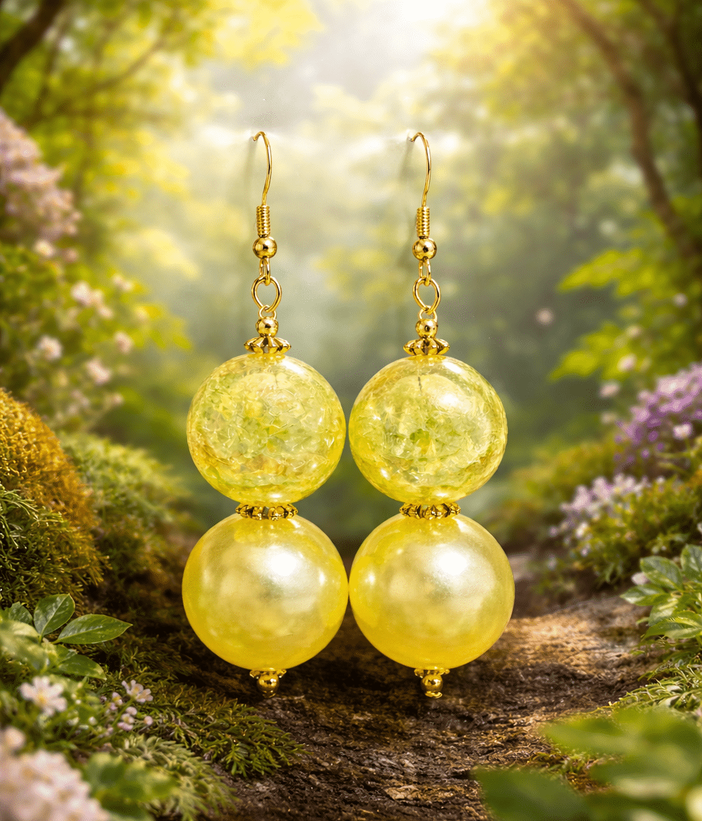 This exquisite design features a luxurious vertical stack of light-reflecting elements in a bright, monochromatic yellow palette. At the top, a large, translucent yellow crackle glass bead catches the light with its multi-faceted interior, creating a sparkling effect reminiscent of morning sunlight. Anchoring the design is a lustrous, high-luster sunny yellow pearl-style bead, providing a smooth and sophisticated finish to the silhouette.