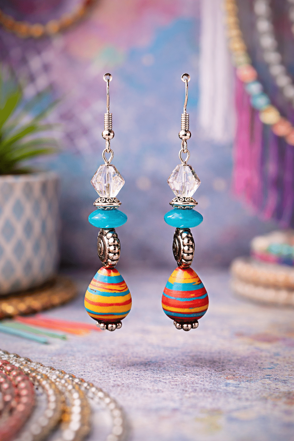 Each earring features a playful vertical stack suspended from polished silver-tone fishhook wires. The design begins with a sparkling clear faceted crystal, followed by a vibrant turquoise-blue rondelle bead. Adding an artisan touch is a detailed silver-tone spiral charm, leading the eye to the stunning focal point: a large teardrop bead featuring a whimsical “layer-cake” pattern of yellow, orange, teal, and red stripes.