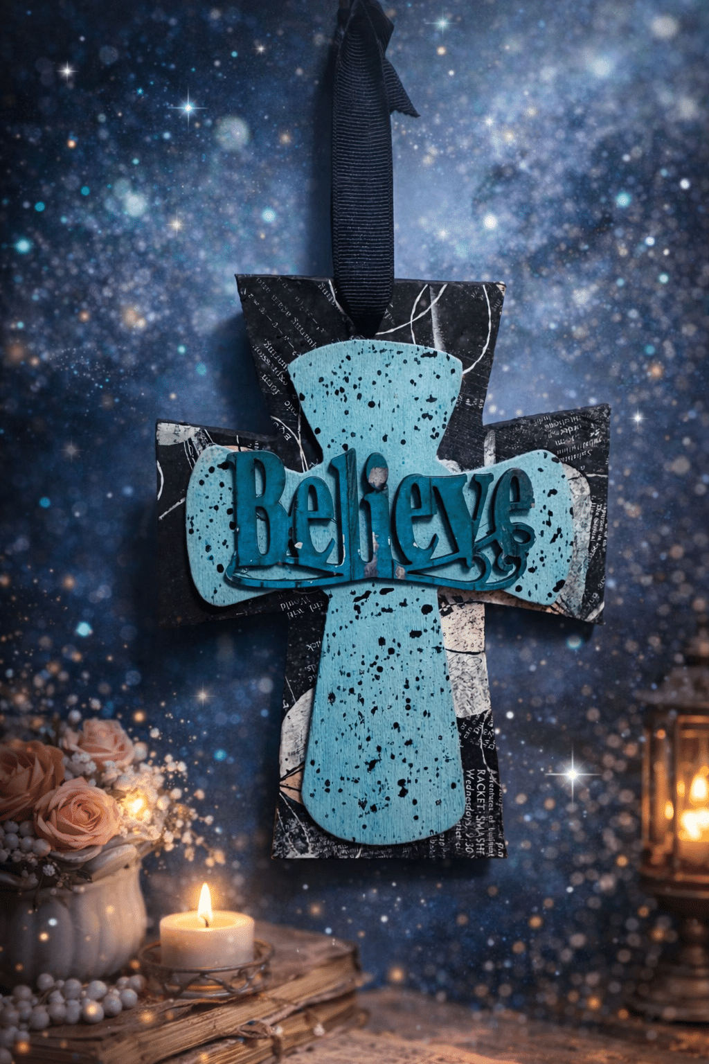 The cross features a bold three-tier layered design that creates a captivating, multidimensional presence. The base layer is adorned with a celestial-inspired print, featuring white swirling script and starburst motifs on a deep midnight-black background. The second layer is a vibrant teal cross with a black speckled “stardust” finish, providing a brilliant pop of color. The design is crowned by a sculpted “Believe” nameplate in a matching distressed teal, serving as a powerful focal point for your daily devotions.