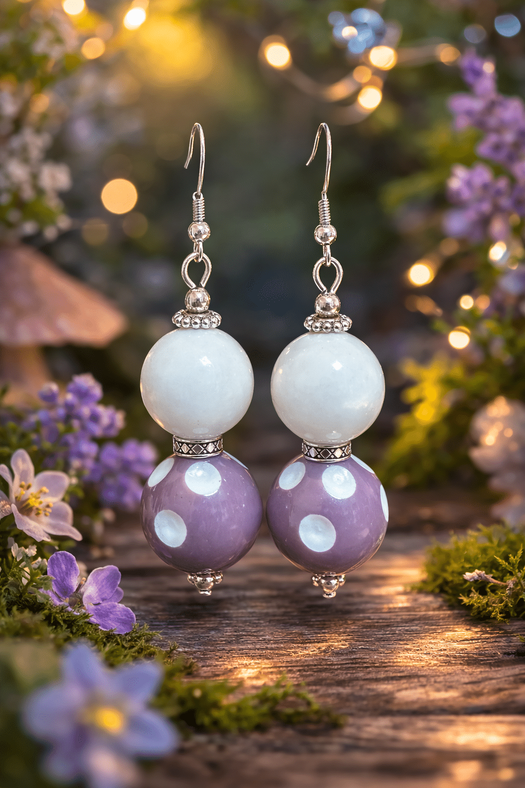 This delightful design features a vertical stack of high-quality artisan beads that capture a sense of whimsical elegance. At the top sits a large, solid opaque white bead with a soft, milky finish. The eye-catching centerpiece is a deep slate gray-black bead adorned with crisp white polka dots, offering a playful, vintage-inspired aesthetic. The combination of smooth surfaces and bold, high-contrast patterns creates a balanced, modern look that transitions perfectly from a day at the office to a casual evening out.