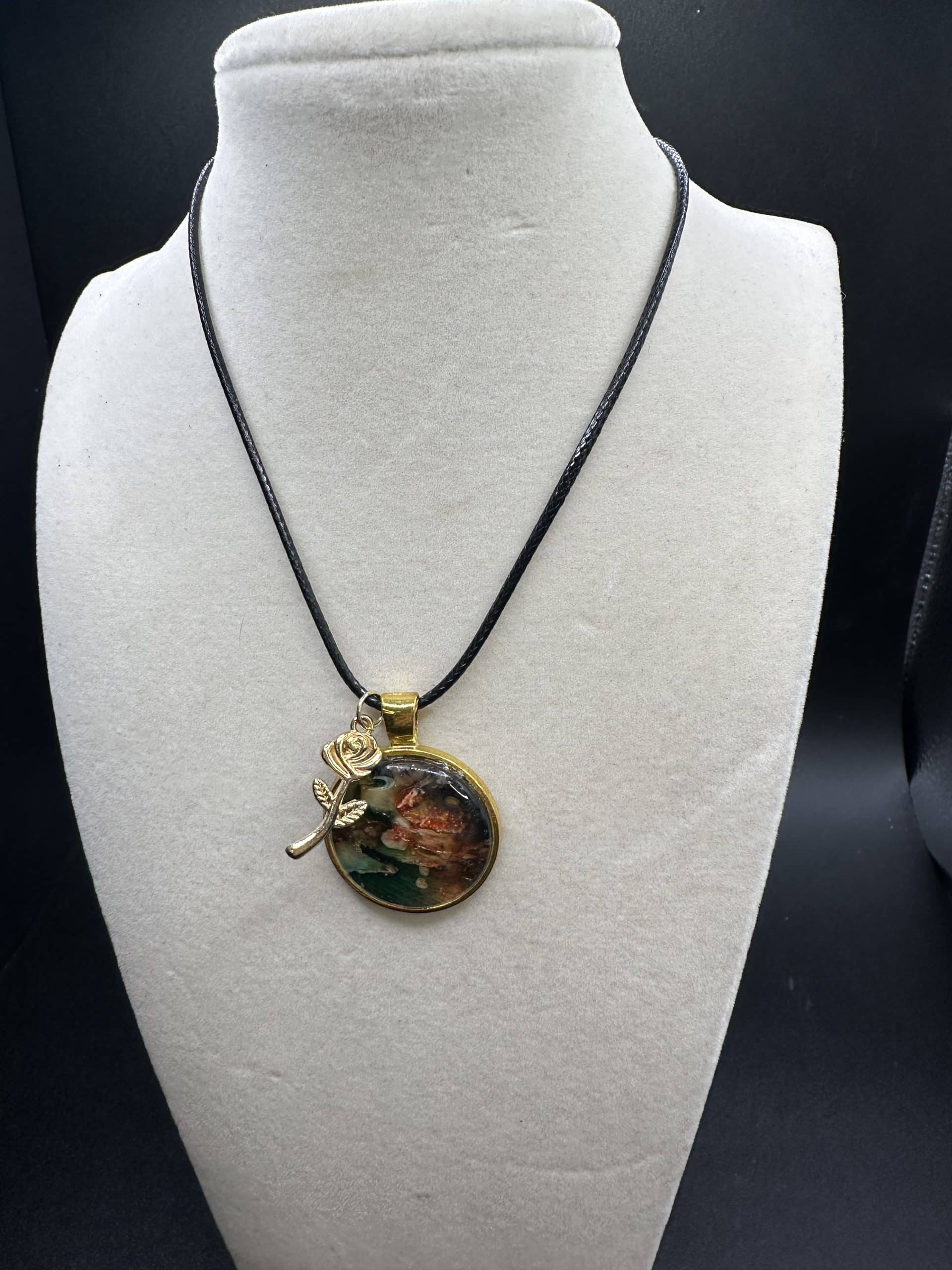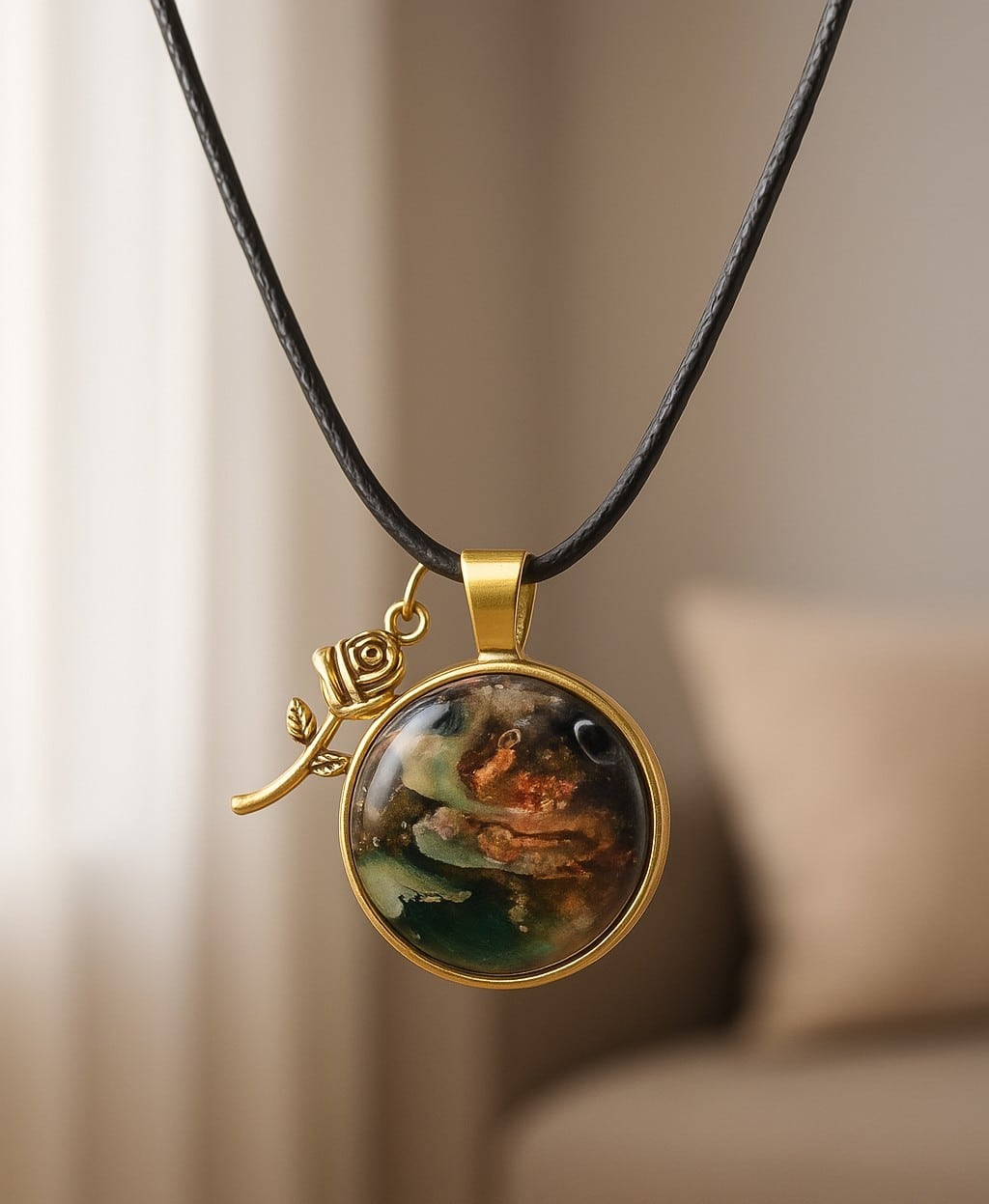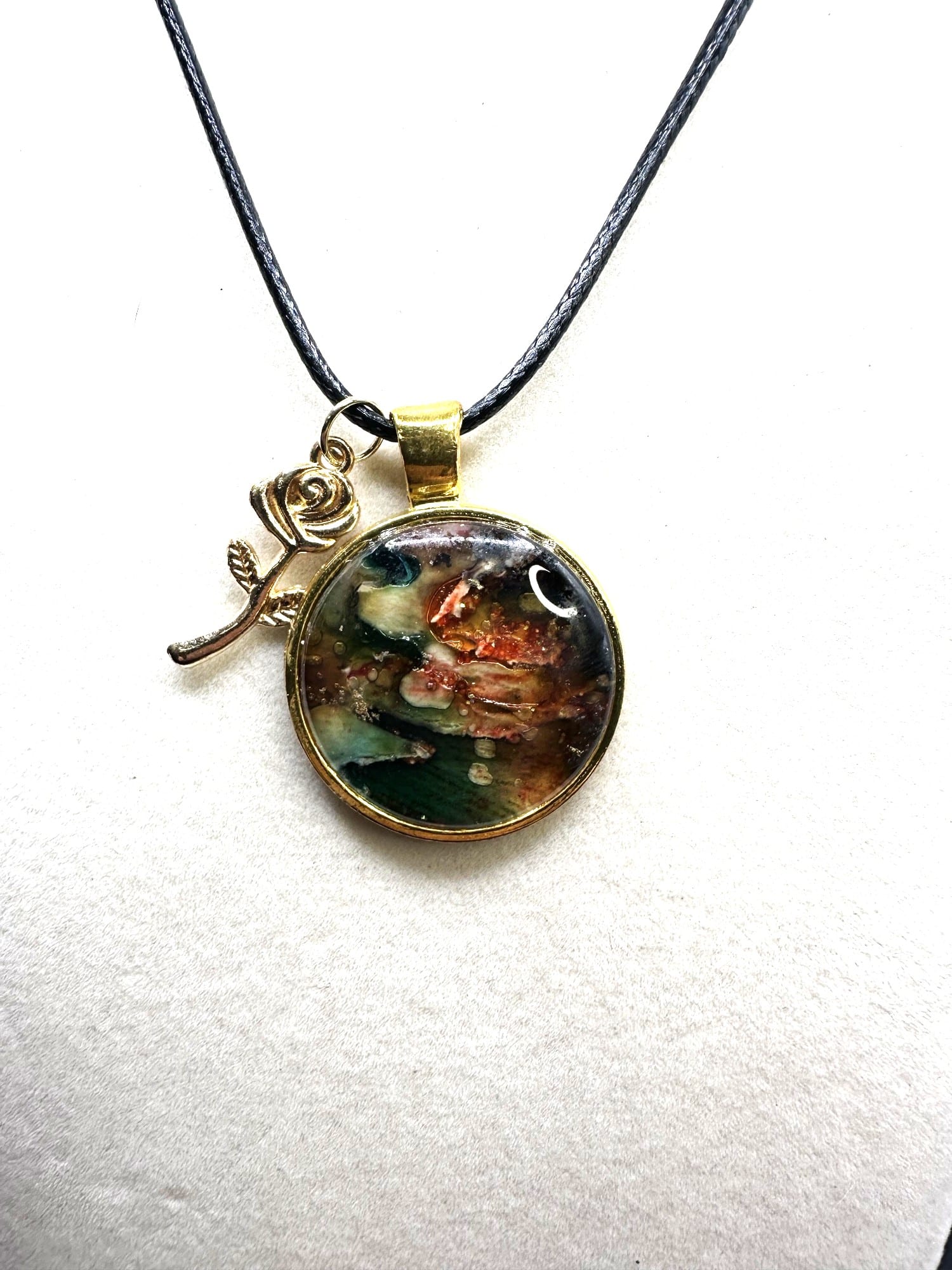 Wear a piece of original art close to your heart with this stunning Handcrafted Resin Art Necklace. This unique pendant features a miniature abstract painting preserved under glass or resin within a gleaming gold-tone bezel. The artwork showcases a mesmerizing swirl of earthy greens, rich coppers, and deep browns, reminiscent of a forest floor or an autumn landscape.