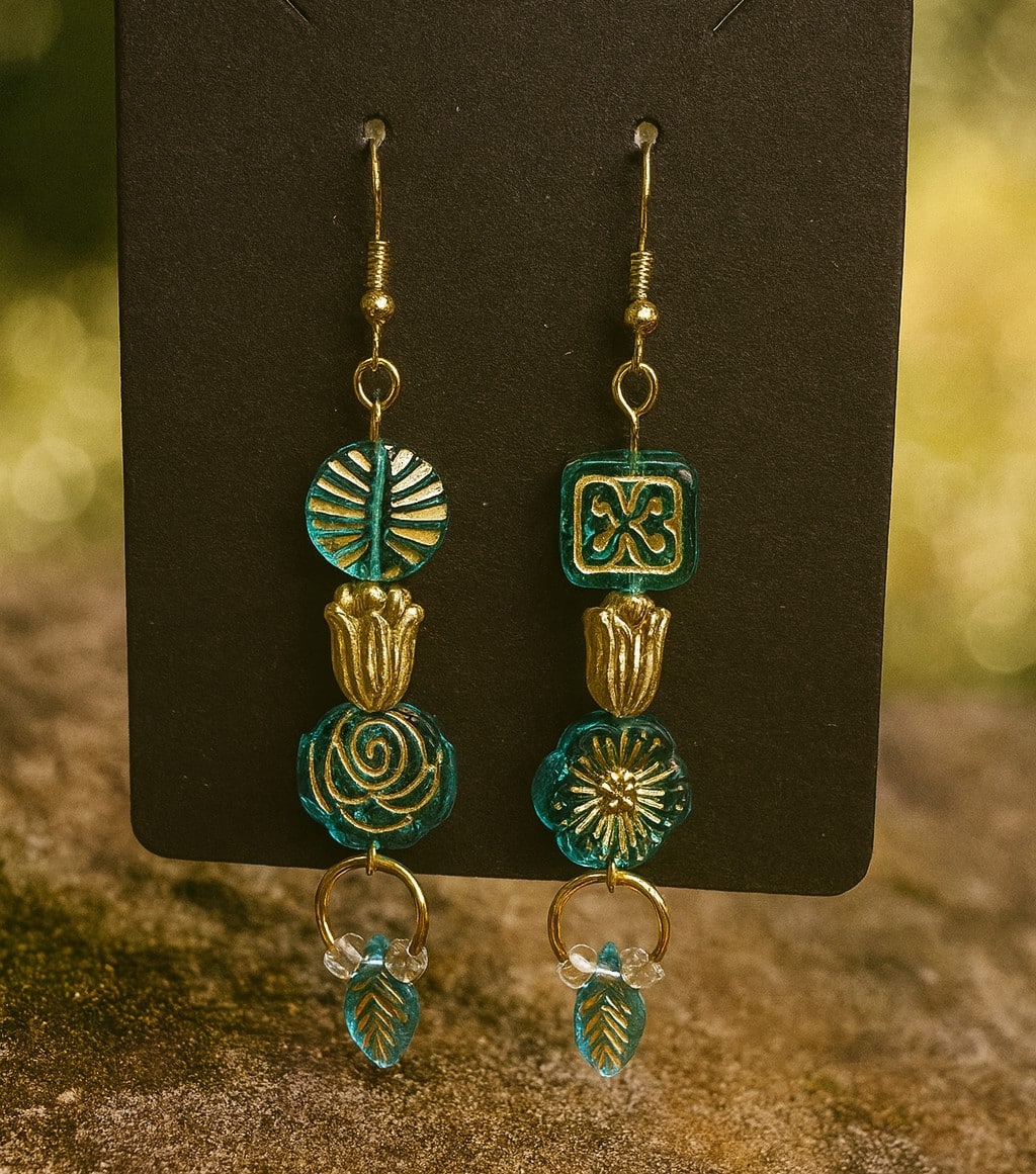 Bring the beauty of a secret garden to your jewelry box with these enchanting Teal & Gold Boho Dangle Earrings. These handcrafted beauties feature a stunning vertical stack of beads that blend vintage charm with nature-inspired motifs.