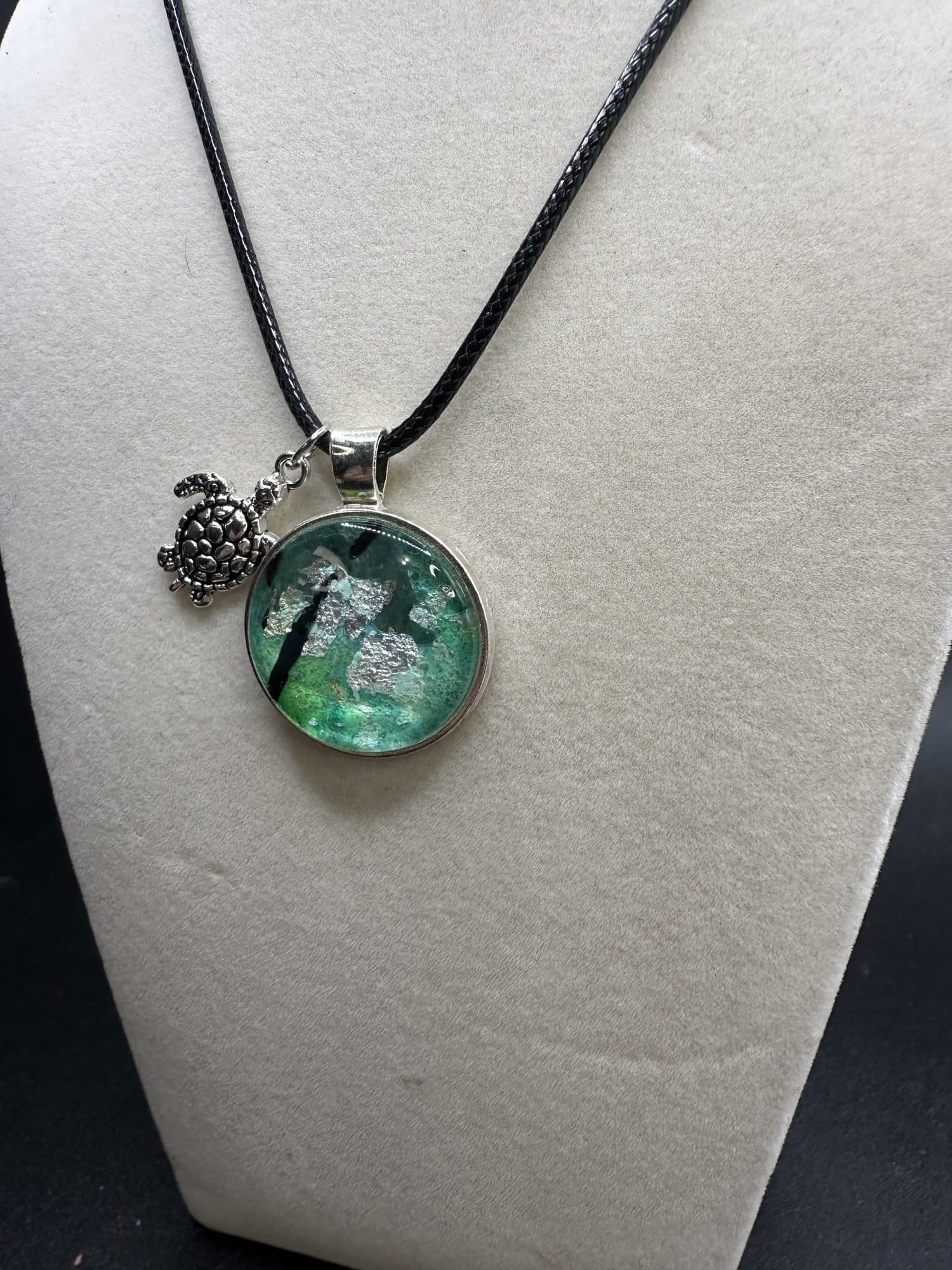 • Pendant: Round silver bezel filled with abstract turquoise/green resin art.