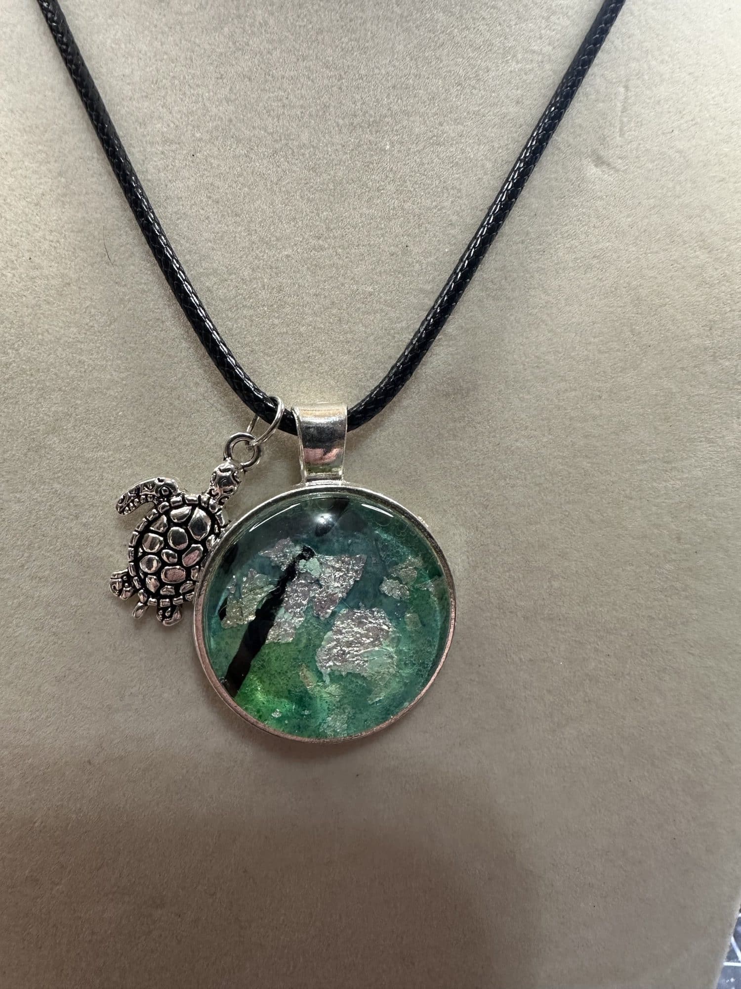 “A sea of tranquility! 🌊🐢 Abstract ocean art meets a lucky sea turtle charm on this stunning, one-of-a-kind pendant.”