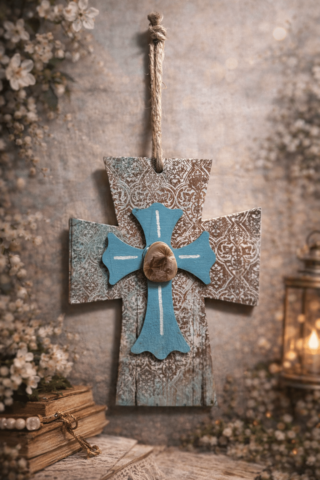 Equipped with a rustic jute twine hanger, this cross is ready to be displayed in a farmhouse-style living room, a bedroom, or as a thoughtful gift for a housewarming or baptism. It perfectly captures a “shabby chic” aesthetic while remaining a powerful symbol of everlasting grace.