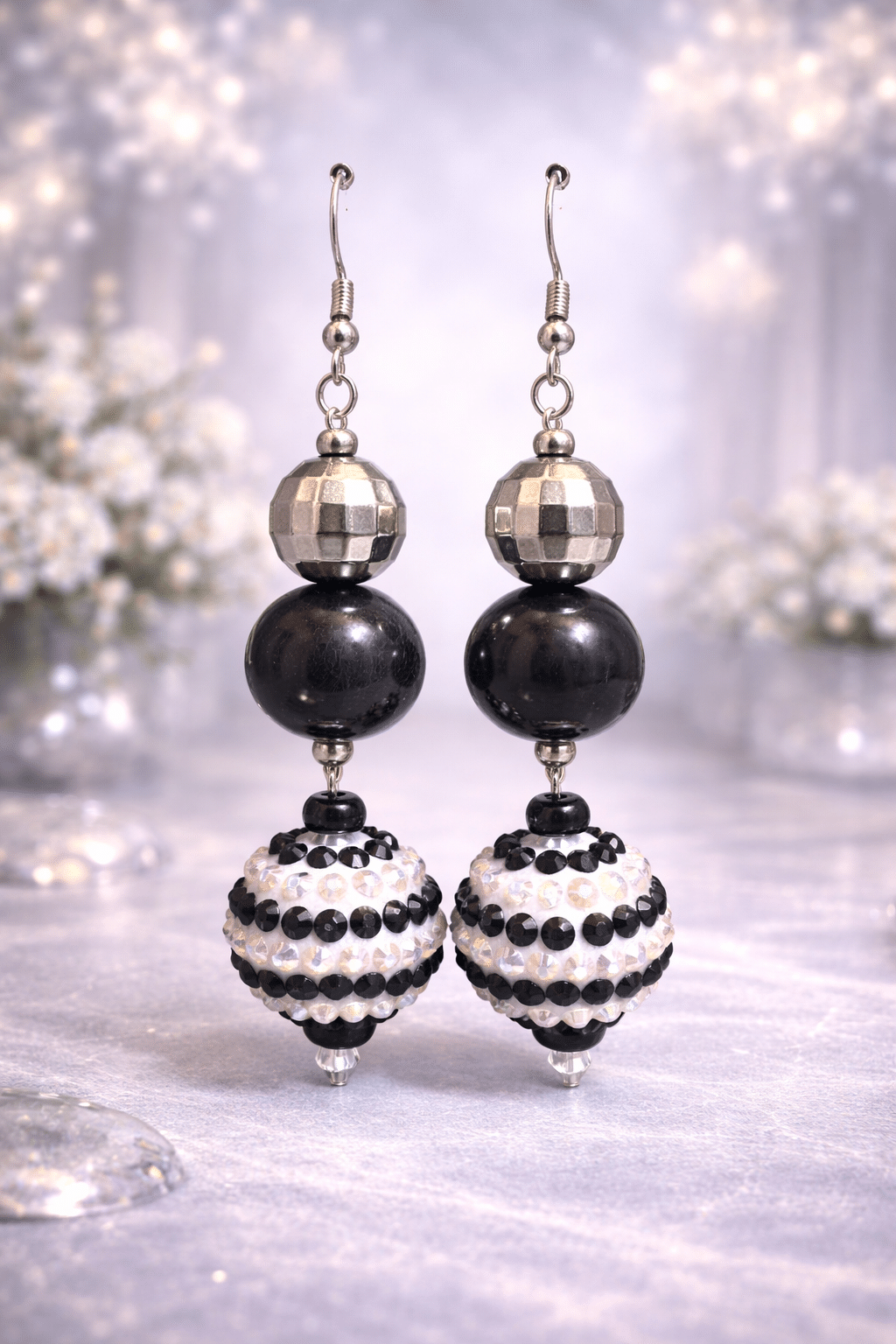 This exquisite design features a luxurious vertical stack of shimmering, multi-textured elements. At the top, a faceted gunmetal silver bead catches the light with a sharp, industrial sparkle. This leads down to a large, lustrous jet-black spherical bead, providing a smooth and classic center. The breathtaking centerpiece is a large, ornate artisan bead encrusted with stripes of black and iridescent clear rhinestones. This pave-style sphere offers a 360-degree brilliance that perfectly captures the light with every movement.