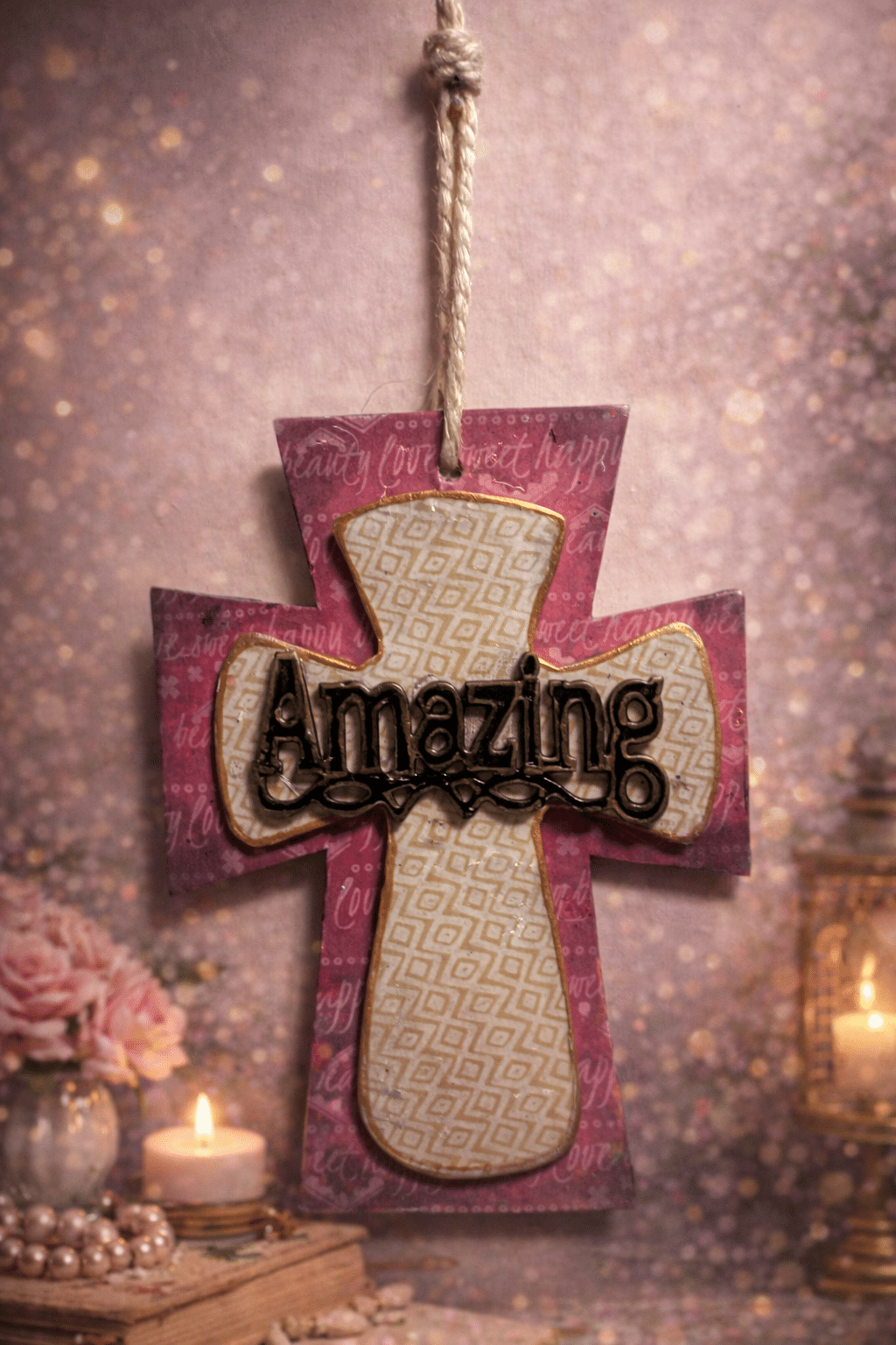 This decorative cross features a dynamic three-tier layered design that creates a rich, dimensional silhouette. The foundation is a deep magenta cross adorned with a subtle script pattern featuring words like “beauty,” “love,” and “happy”. The middle layer is a soft cream cross with a gold-toned geometric diamond pattern and hand-painted gilded edges. The final focal point is a bold, black and bronze-tone “Amazing” nameplate, reminding us of the transformative power of grace.