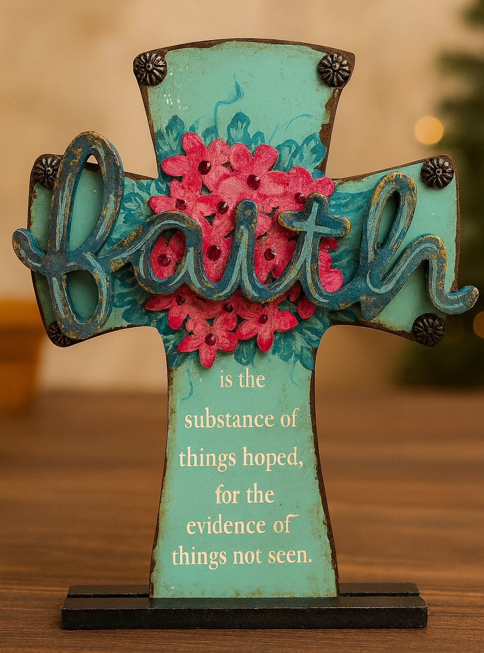 Bring a touch of spiritual encouragement to your home with this beautifully detailed Standing Faith Cross. This piece features a distressed turquoise finish that gives it a charming, rustic farmhouse appeal.